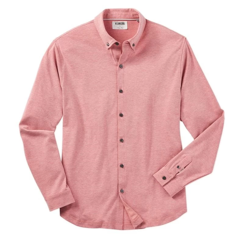 Styled as a long sleeve woven shirt, this knit shirt is made from a comfortable cotton blend performance / moisture-wicking fabric.